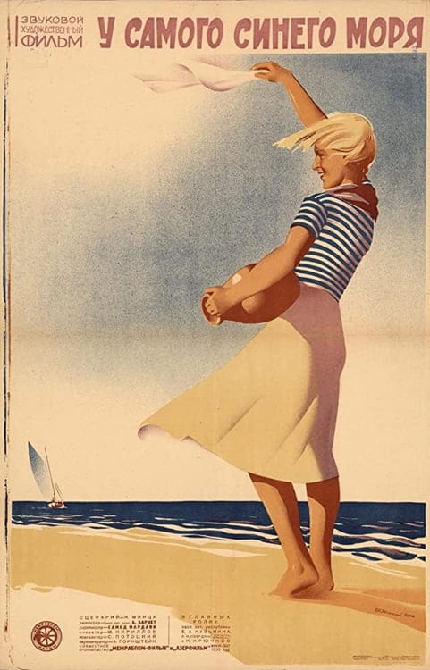 En su película “Al borde del mar azul” (U samogo sinego morya, 1936), Barnet cuenta una historia que, en Alemania, Käutner contaría una y otra vez, y mucho mejor, la del triángulo amoroso y el mar, en un marco apolítico. Dos náufragos, Yussuf (Lev Sverdlin) y Alyosha (Nikolay Kryuchkov), son rescatados por un barco de pescadores que, prácticamente, los deja varados en una isla edénica (en Azerbaiyán, sobre el Mar Caspio), donde conocen a Mariíta (Yelena Kuzmina), una rubia insulsa, que resulta ser jefa de la brigada femenina en un koljós, después de escasos minutos de echar a andar por la playa. Descubrimos que los náufragos son mecánicos, con la misión expresa de viajar a la isla a suplir a los locales -enviados fuera, a servir en el ejército-, pero, al momento de presentar los documentos que los avalan como tales, se dan cuenta que sólo llevan consigo un par de papeles deslavados por el mar. Yussuf y Alyosha son instalados en el koljós “Llamas del comunismo”, y pronto se adaptan a la vida de la isla. Yussuf, pone la nota cómica en el trío, y Alyosha se queja de “dolores en el corazón”, para evitar salir a la pesca. Prefiere pasar a la casa de Mariíta, dejarle flores y todo podría haber seguido en un tono de felicidad sonriente, de no ser por los celos de Yussuf. No faltan los actos heroicos, en medio de la tempestad, y la tragedia aparente, en una cinta que se decanta, gran parte del metraje, a mostrar el oleaje embravecido, eso sí, bellamente fotografiado por Mikhail Kirillov, pero cuya reiteración llega a ser cansina.