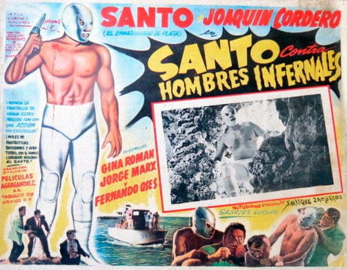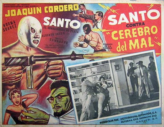 Tras un largo paréntesis que corresponde a los años 1953-1957, periodo en el que la revista editada por José G. Cruz alcanza el paroxismo de popularidad, nuestro héroe debuta en el medio fílmico en el díptico integrado por “Santo contra el cerebro del mal” (El Cerebro del mal) y “Santo contra los hombres infernales” (Cargamento blanco), realizado en La Habana por el veterano Joselito Rodríguez y financiado por la Agrupación de Técnicos Cinematográficos de Cuba y los empresarios mexicanos Jorge García Besné, Carlos Garduño G. y Jesús Alvariño. Ambas películas contaron con Enrique Zambrano, Fernando Osés y Antonio Orellana en las labores de argumento y guión, y fueron filmadas justo antes de que las huestes de Fidel Castro Ruz tomaran la capital de Cuba como señal del triunfo de la Revolución que derrocó la dictadura de Fulgencio Batista. A sus premuras y limitaciones de producción, las cintas agregaron la manifiesta incapacidad de su director para sacar el mejor provecho de ellas. Como ya se había vuelto costumbre entre los cineastas de su generación, Joselito Rodríguez despachó las obras de la manera más rápida posible. En cada una de sus primeras aventuras cinematográficas, “El Enmascarado de Plata” se enfrenta a un villano malévolo que lo somete a hipnosis para que cometa toda suerte de fechorías y a varios mafiosos contrabandistas de droga en el Caribe. De esta forma, el personaje se adscribió plenamente a las convenciones genéricas que más convenían a su condición de hombre justiciero proveniente del insólito mundo de la lucha libre, espectáculo que para esos años ya había cobrado un enorme arraigo popular. Cabe advertir que algunas de esas convenciones, que implicaban el rotundo y maniqueo triunfo del bien sobre el mal, fueron plenamente establecidas desde varias décadas atrás por el cine “Made in Hollywood”, pero cada cinematografía más o menos nacional las incorporó a diversas manifestaciones de su respectiva cultura local y hasta regional con el objeto de proponer ciertas formas de identidad. Como bien lo ha expresado Nelson Carro: “Es imposible negar que, sin ser actor, el Santo tuvo ese algo que siempre tienen los mitos (ya que de otra forma sería difícil justificar su éxito y no el de imitadores como Blue Demon y Mil Máscaras). Tal vez se deba a que su aparición se dio en un momento oportuno, a que el público estaba deseoso de un héroe nacional con quien identificarse. Como todos los grades mitos del espectáculo, su fama trasciende la mera especulación y la manipulación de los medios, la publicidad y el dinero” [4].