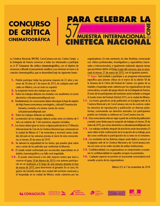 Para celebrar la edición 57 de la Muestra Internacional de Cine, la Cineteca Nacional, IMCINE, CorreCamara.com, Contra Campo TV y la Embajada de Francia convocan a todos los interesados a participar en el 2o Concurso de crítica cinematográfica, con el objetivo de reconocer y difundir el pensamiento analítico y sus misiones en torno a la creación cinematográfica, que se desarrollará bajo las siguientes BASES:
