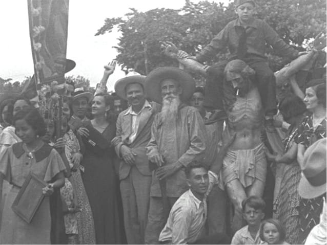 Tomás Garrido Canabal posa con un grupo de personas antes de la quema de objetos religiosos, entre ellos la figura de Cristo ridiculizada con un cigarro entre los labios. Tomada de: [Tomás Garrido Canabal. Marcha, quema de Cristo, embarcaciones “Plutarco Elías Calles” y “Presidente Obregón”].