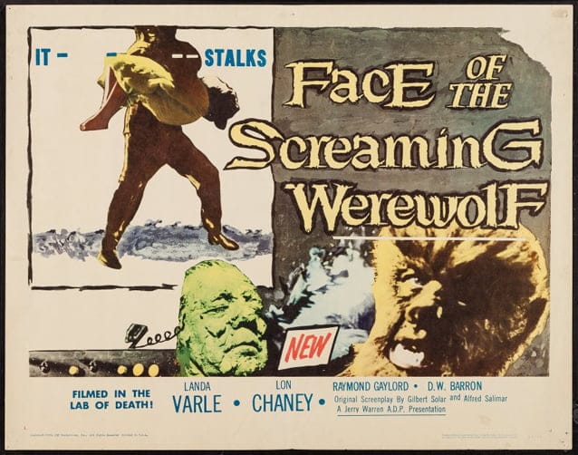 “Face of the Screaming Werewolf” (Gilberto Martínez Solares, Rafael Portillo y Jerry Warren, 1964), es un caso de película estadunidense de explotación resultado de “cortar” y “pegar”, en la sala de montaje o edición, escenas completas de dos películas mexicanas anteriores, remontadas con nuevas escenas añadidas, y filmadas en los Estados Unidos, para entregar una tercera película pero con resultados nefastos. “La casa del terror” y “La momia azteca” habían parido un engendro en el cual se movían, en una historia ilógica, que apenas se podía coger por algún lado, Lon Chaney Jr bajo su disfraz de hombre lobo, la resucitada momia azteca y hasta Tin Tan.