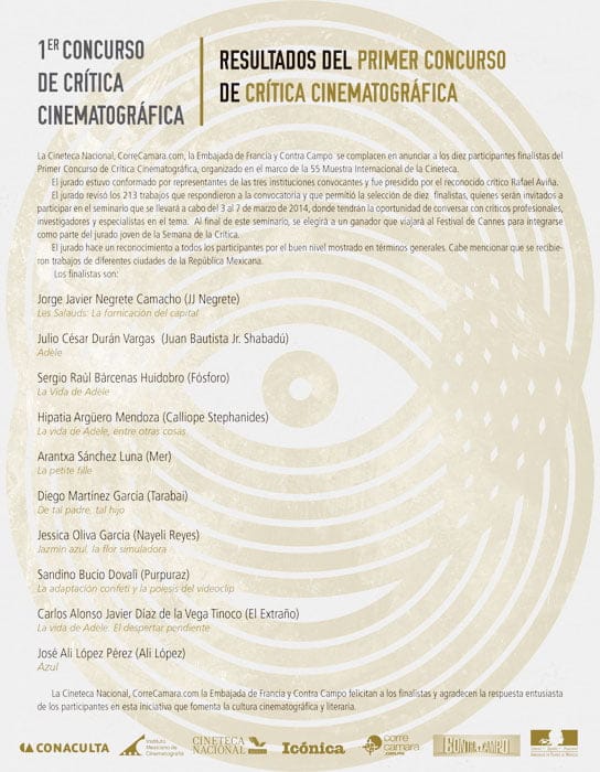 La Cineteca Nacional, CorreCamara.com, la Embajada de Francia y Contra Campo se complacen en anunciar a los diez participantes finalistas del Primer Concurso de Crítica Cinematográfica, organizado en el marco de la 55 Muestra Internacional de la Cineteca .