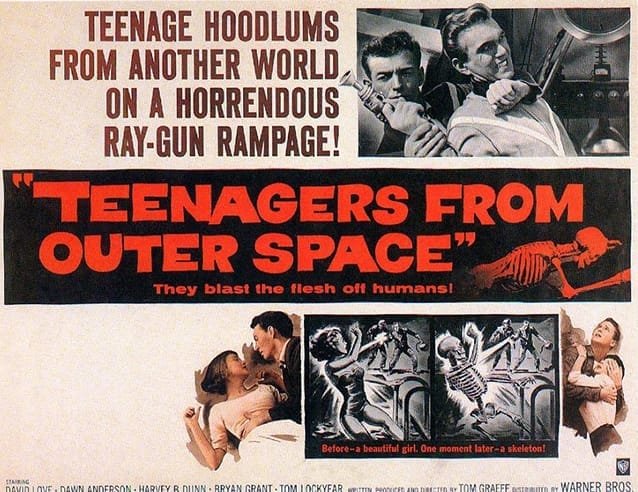 “Rebeldes del espacio” (aka. Adolescentes del espacio exterior, Teenagers from Outer Space, 1959), de Tom Graeff, se exhibió en México unos años después de su estreno americano, y el título que se le dio en el país (“rebeldes”) sugería que la juventud, en cualquier lugar del universo, adolecía de los mismos defectos que los chicos de la Tierra —eran los primeros años del rock and roll que se apoderaba de la radio y los cafés—, sin embargo —con todo y sus malísimos diálogos de pura Serie B—, la historia iba más allá, al mostrar al extraterrestre Derek (David Love, seudónimo del actor Chuck Roberts), quien se oponía a los designios de la misión de destrucción que les había sido encomendada, al inclinarse por preservar la vida de un planeta ajeno (en el suyo los viejos son eliminados, se entiende, en pos de una eugenesia, ya que el capitán expresa “somos una raza superior, poseemos armas superiores”), en oposición a que nuestro mundo sirva de granja de los “Gargons”, una especie de ganado espacial —en realidad langostas, agigantadas con primitivos efectos especiales de cámara—, tan salvaje que incluso los invasores temen. Los pilotos espaciales recorren arriba y abajo la calle de Sunset Blvd. en sus baratos uniformes de utilería, y alguno con un casco desechado de piloto de avión, poniendo cara de malos y actuando un poco mejor. El título original se valía del impulso que la influyente película “Yo fui un hombre lobo” (1957), de Gene Fowler Jr. —cuyo título original en inglés es “I Was a Teenage Werewolf”, es decir, “Yo fui un hombre lobo adolescente”—, había provocado en una ola sucesiva de imitaciones.